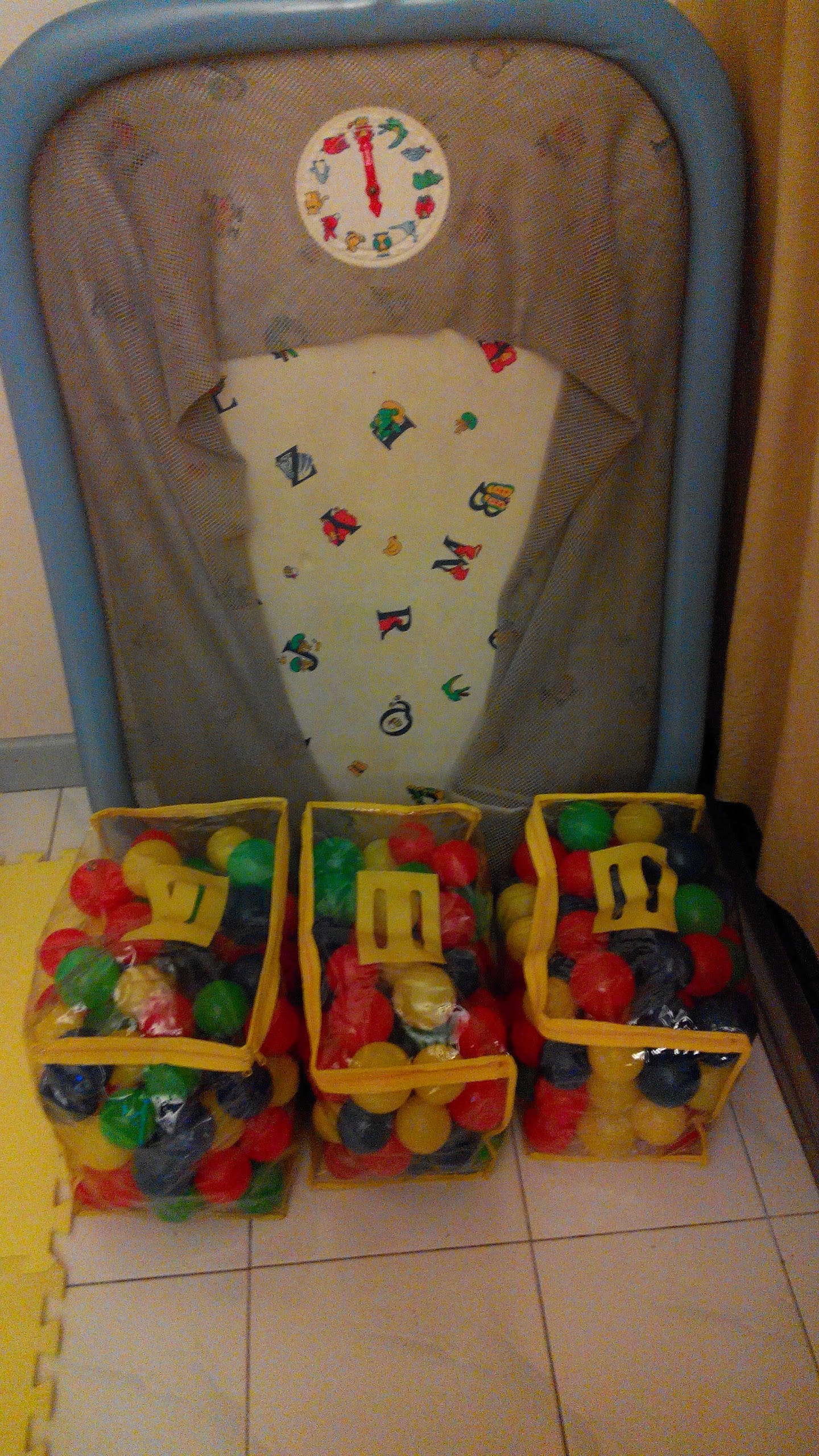We added small colourful balls into the playpen and all 3 kids had fun....